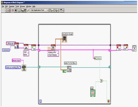 采用DAQmx函數(shù)操作,包括創(chuàng)建采集任務(wù)、設(shè)置輸入緩存大小、配置觸發(fā)方式、啟動AD轉(zhuǎn)換、讀取和保存波形數(shù)據(jù)、停止AD、清除任務(wù)、錯誤處理等節(jié)點的搭配。由于本數(shù)據(jù)采集任務(wù)為高速瞬態(tài)的數(shù)據(jù)采集,因此需要設(shè)置一個大的輸入緩存,否則程序就會報錯,本設(shè)計在編程時設(shè)置輸入緩存為2M字節(jié)。由于二進(jìn)制的數(shù)據(jù)體積小,可以節(jié)約磁盤空間,并且存取速度快,因此數(shù)據(jù)保存采用二進(jìn)制方式保存。如果需要在線處理數(shù)據(jù)或者觀測頻譜圖,可以添加相應(yīng)的函數(shù)功能,非常方便。由于自主研發(fā)的傳感器輸出有效信號為0~+10V,故在配置數(shù)據(jù)采集任務(wù)時應(yīng)配置其為同樣的范圍,數(shù)據(jù)采集程序如圖3所示。